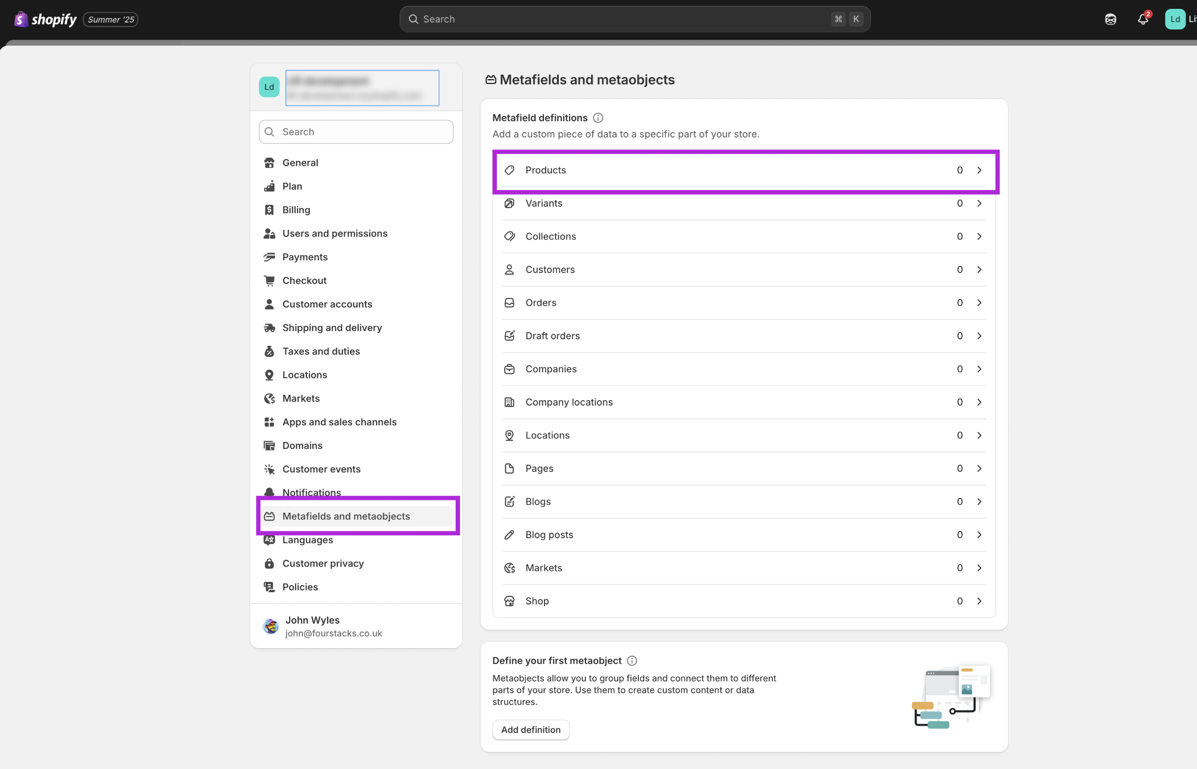 - From your Shopify admin go to Settings > Metafields and Meta Objects > Products