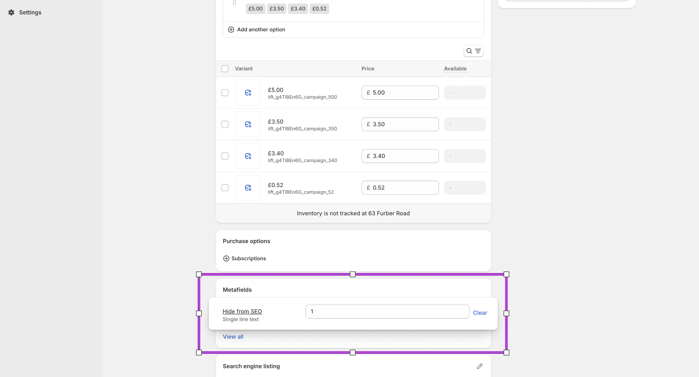 - Navigate to the donation product you wish to hide. Scroll down towards the bottom of the page until you reach the section titled "metafields":