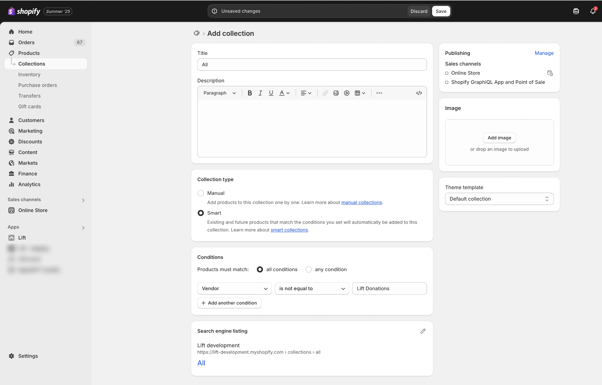 - Next add a condition with the parameters: Vendor - is not equal to - "Lift Donations"