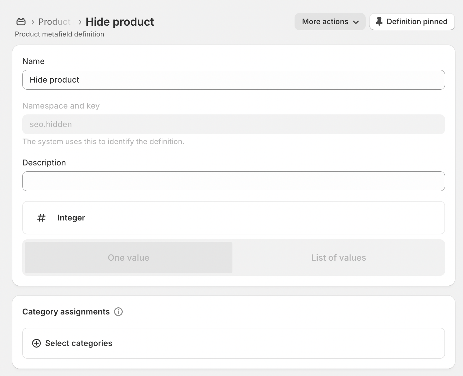 - Add a new metafield definition. Set the name to "Hide Product" and the namespace and key to